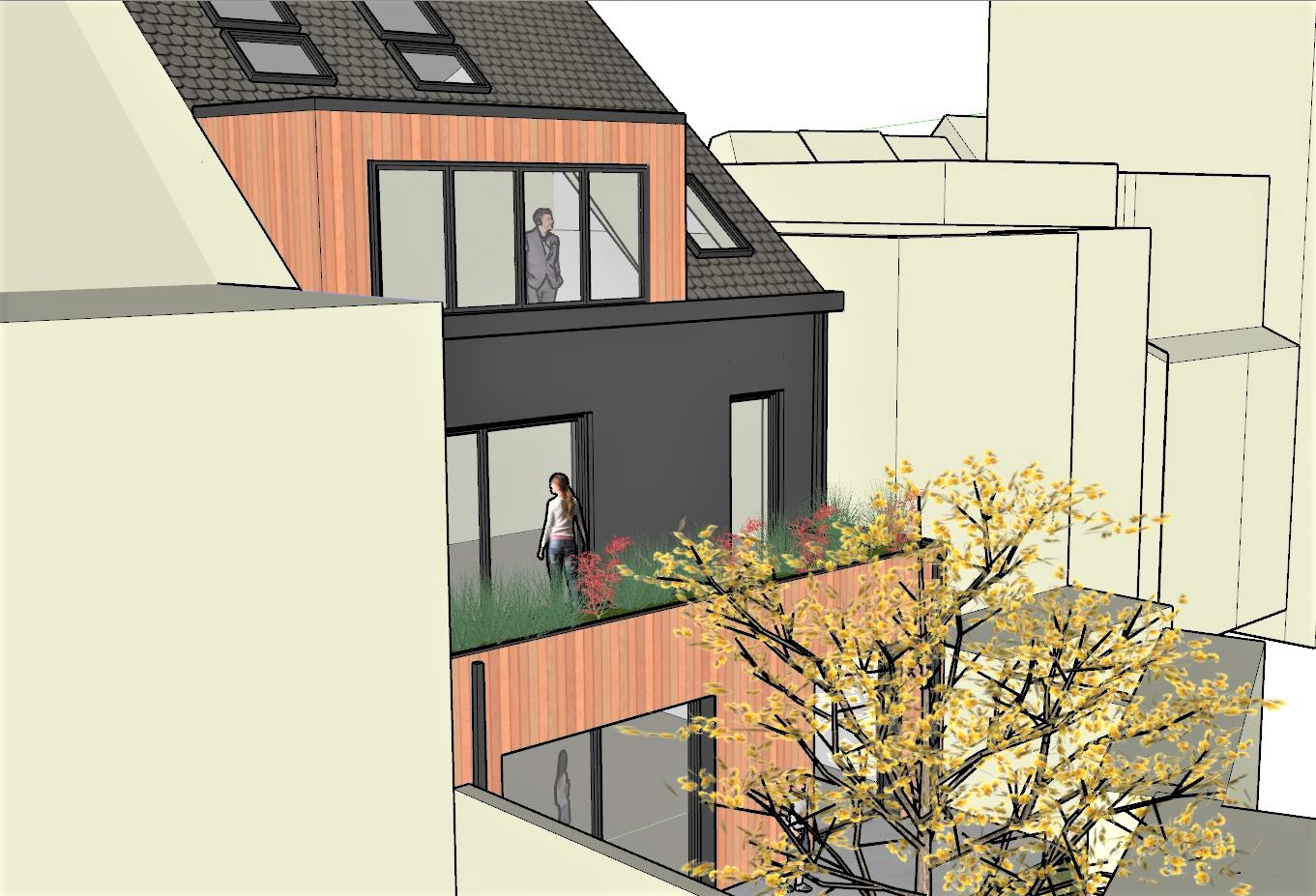 Le projet consiste en la modification de 2 appartements 1 chambre en 2 appartements 2 chambres, l'ajout d’une unité de logement en duplex et la création d’une extension et d’une lucarne en toiture arrière